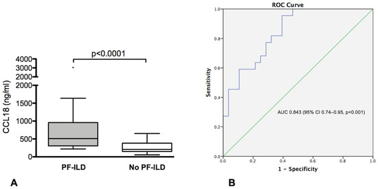 ROC curve analysis to assess the performance of CCL18 in identifying patients with PF-ILD showed an area under the curve (AUC) of 0.843 (95% CI 0.74–0.95, p < 0.001) (Figure 2B). Using a threshold of 303.5 ng/mL, defined by the ROC curve, CCL18 showed an 82% sensitivity, 69% specificity, 67% PPV and 83% NPV in predicting the occurrence of PF-ILD in our cohort.