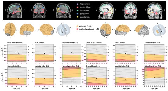 Automated AI-based software was used to determine quantitative analyses of the volume of different brain areas in mL and age- and sex-adjusted percentiles (based on an internal reference collective of age- and sex-adjusted healthy controls from the general population embedded in the software). This commercially licensed MRI post-processing software, named “mdbrain”, is provided by mediaire GmbH, Berlin, Germany, an approved medical device manufacturer according to the European Medical Device Directive 93/42/EEC, and is certified according to DIN EN ISO 13485:2016. The “mdbrain” software is approved as a CE-marked medical device. It performs automatic brain volumetry of different brain regions using native 3D T1-weighted sequences to allow quantitative statements based on an extensive population-based normative database. The algorithm and embedded normative database are trained nationwide, not limited to the experience of a single centre, and have been validated for accuracy [].