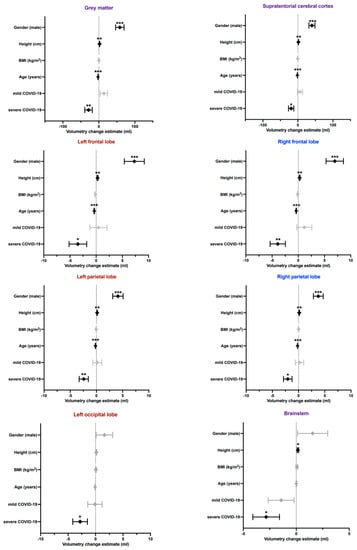 In addition to established determinants of brain volume such as age and sex, the BMI, height and COVID-19 severity (MILD and SEV) were co-analysed as variables in a multivariate model, yielding statistically significant effects of COVID-19 on brain volume decline in the following areas (Table 5; a complete list of results are shown in Supplementary Table S3): whole brain grey matter, supratentorial grey matter, both frontal lobes, both parietal lobes, precuneus right, occipital lobe left, thalamus right and brainstem. The estimated impact of the respective variables on the selected brain volumes is graphically illustrated in Figure 2. Regarding brain percentiles, a statistically significant contribution of severe COVID-19 to the whole brain volume could be detected.