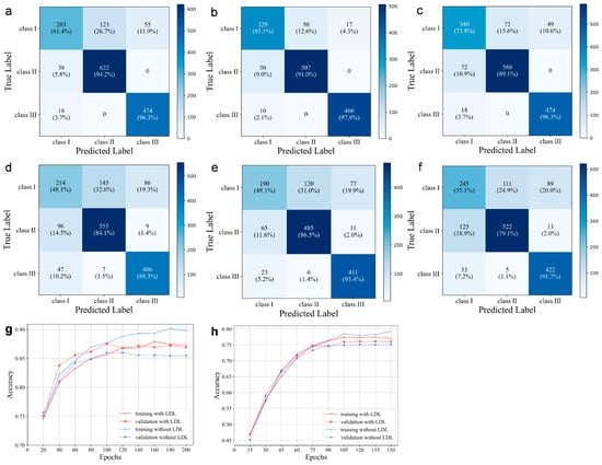 Confusion matrix on AP-all, AP-sub, and AP-all with LDL of lateral cephalograms (a–c) and profile photographs (d–f). The training and validation accuracies on AP-all with and without LDL for the lateral cephalograms (g) and profile photographs (h), respectively.