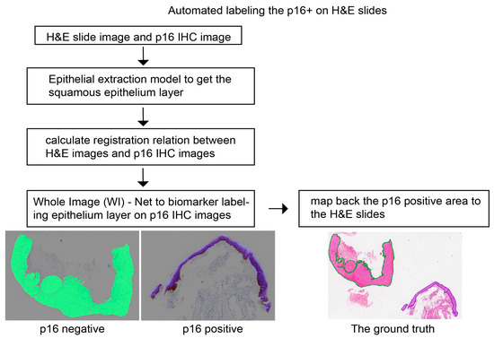 The annotations of the p16-positive region on the H&E slides were obtained automatically from the registration of the p16-positive region, which was detected in the p16 IHC images by a pre-trained whole image (WI)-Net [19].