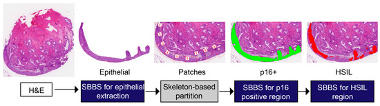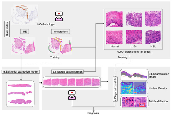 Two typical steps are involved in artificial intelligence approaches: deep learning and hand-crafted feature engineering. (a) Epithelial extraction model to isolate the squamous epithelium layer from the H&E slides; (b) Skeleton-based partition to get vertically divided patches based on a distance transform-based medial axis; (c) Diagnostic module: tissue-level analysis (HSIL and p16- positive area segmentation model on H&E) and cell-level analysis (nuclear density, mitotic detection).