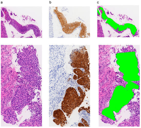 The p16-positive area highlight and analysis. (a) H&E of the squamous epithelium of the uterine cervix; (b) p16 IHC of the squamous epithelium of the uterine cervix; (c) the artificial intelligence model identified the p16-positive area on H&E.