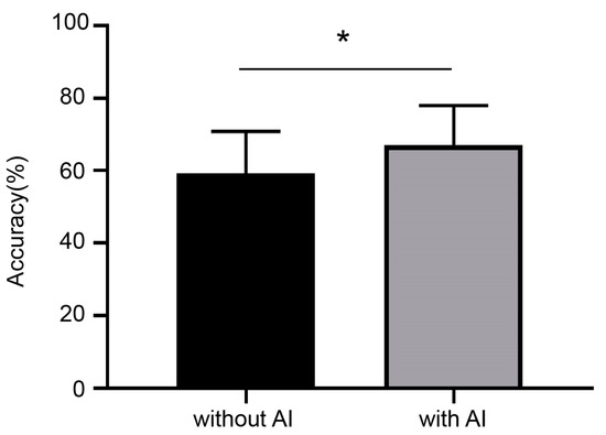 Comparisons with pathologists and a pilot study of AI assistance. The accuracy of pathologists was improved with the assistance of AI. * p < 0.05 (t-test) indicates statistically significant difference.