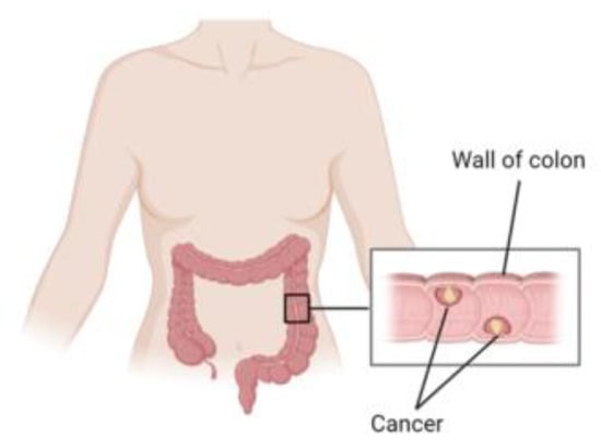 Colon cancer in the wall of the colon. Figure created with Biorender.com (accessed on 1 March 2023).