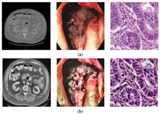 From left to right, the colon images of CT, colonoscopy, and histology, respectively, (a) before and (b) after pre-processing.