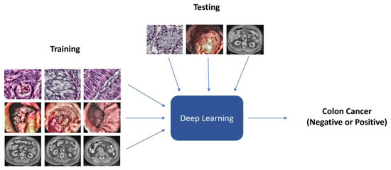 Cancer is an oftentimes rapidly spreading disease that drastically affects human health [1]. One of the most common types of cancer is colon cancer, which is sometimes caused by polyps in the colon wall, as shown in Figure 1 [2]. Colon cancer is the second and third most prevalent cancer in terms of death and incidence rates, respectively [3]. Consequently, previous studies have proposed many methods for improving the detection of colon cancer [4,5,6,7]. Medical imaging is one method used for detecting colon cancer. However, dealing with large numbers of medical images causes difficulties for specialists, which results in delays in the detection of colon cancer and, thus, delays in treatment. Therefore, automating the detection of colon cancer using deep learning (DL) attends to these challenges effectively.