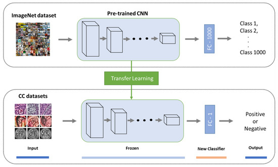The DL approach used for predicting colon cancer and distinguishing between normal colons (negative) and colon cancer (positive) is shown in Figure 3. is a training set that includes m-labeled images obtained from various imaging modalities. Each training example has a class label (0 or 1), where 0 indicates a normal colon and 1 indicates colon cancer. This study used five pre-trained CNN models, including VGG16, VGG19, ResNet152V2, MobileNetV2, and DenseNet201. We adapted the five DL models to our problem using a transfer learning method based on the ImageNet dataset and feature extraction technique [40], whereby all layers were frozen with weights of ImageNet except for the last layer, which was replaced by a new dense layer that had one neuron and sigmoid activation and was trained independently on each of the colon cancer datasets, as shown in Figure 4. Each of the five DL models were trained independently on processed images of a given modality. Then, the unseen datasets were tested on the trained models of the same modality to generate predictions mapped to 0 and 1 as follows: if the prediction is greater than 0.5, it is set to 1, which thus indicates colon cancer; otherwise, it indicates a normal colon.