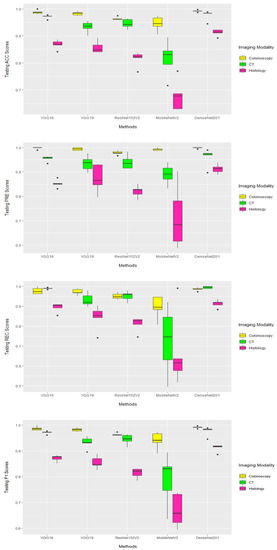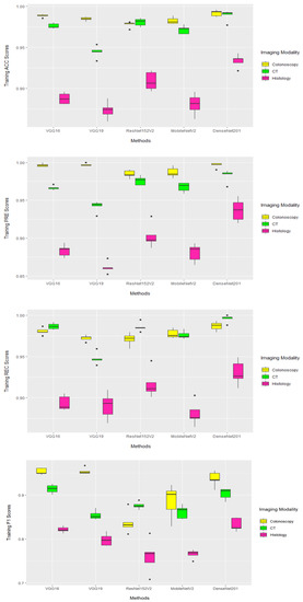 Figure 5 illustrates the performance of the DL models when applied to images derived from imaging modalities on the training sets during a five-fold cross-validation based on the ACC, PRE, REC, and F1 performance measurements. The boxplots showed that DenseNet201 generated the highest performance results, according to ACC and PRE, when coupled with images derived from colonoscopy and CT imaging modalities. When DenseNet201 was coupled with images derived from CT imaging modality, it generated the highest results. The DL models achieved poor performance results when they were coupled with images that were derived from a histology imaging modality.