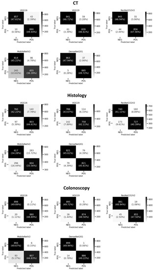 The combined confusion matrices of two categories (normal colon (NEG) and colon cancer (POS)) based on five DL models using five-fold cross-validation on the test sets for each of the CT, histology, and colonoscopy.