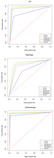 Figure 6 shows that DenseNet201 achieved the best average performance results when coupled with images that were derived from colonoscopy and CT imaging modalities. Specifically, DenseNet201 (when coupled with colonoscopy-based images) achieved 99.1% (99.8% and 99.1%) according to ACC (PRE and F1, respectively). Moreover, it obtained the best average REC of 99.4% for images that were derived from a CT imaging modality, as shown in Table 2. For images derived from a histology imaging modality, MobileNetV2 achieved the lowest average performance results (66.6–71.4%) based on employed performance measures. According to Table 2, the colonoscopy imaging modality, when coupled with the DenseNet201 model, achieved the most reliable performance results. Figure 7 illustrates the combined confusion matrices of a five-fold cross-validation on the test sets. For each DL model and imaging modality, the sum of five test splits corresponds to the combined confusion matrices, and the sum of entries indicates that the whole dataset was used. Figure 8 displays the ROC curves for five DL models applied to the image datasets obtained from CT, histology, and colonoscopy imaging modalities. The DL model with the highest curve indicates the highest AUC results. It can be seen that DenseNet201 archives the highest AUC values, which are recorded in Table 2.