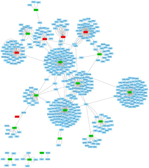 - Shannon, P.; Markiel, A.; Ozier, O.; Baliga, N.S.; Wang, J.T.; Ramage, D.; Amin, N.; Schwikowski, B.; Ideker, T. Cytoscape: A software environment for integrated models of biomolecular interaction networks. Genome Res. 2003, 13, 2498–2504. [Google Scholar] [CrossRef]