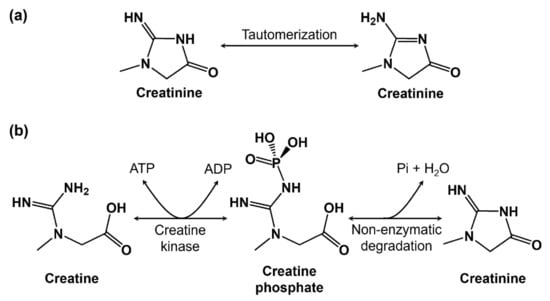 The clinical diagnosis of renal malfunction, acute kidney injury (AKI), or chronic kidney disease (CKD) is performed by monitoring creatinine concentration in human serum. Creatinine is a muscle’s metabolic waste, produced from the conversion of creatine and creatine phosphate with the release of energy [,], as shown in Figure 1. Creatinine enters the bloodstream, is filtered by the kidneys, and is excreted through urine []. Pottel et al. [] and Ceriotte et al. [] established normal creatinine levels in blood in separate studies (see Table 1). Creatinine levels above and below the normal range are considered toxic. Abnormal levels of creatinine may be a sign of diabetic nephropathy, eclampsia, glomerulonephritis, pre-eclampsia, pyelonephritis, a reduction in renal blood flow, renal failure, urinary tract obstruction, etc. Hence, creatinine is used as a disease biomarker in predicting important health outcomes.