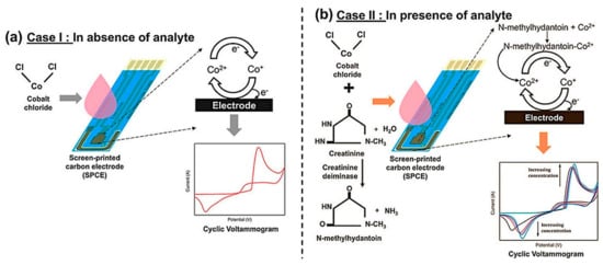 The latter is usually performed by enzymatic receptors such as creatinine deiminase (CD), while in non-enzymatic methods, nanomaterials/polymers are used for the direct determination of creatinine using a redox probe such as [Fe(CN)6]3−/[Fe(CN)6]4−. The range of techniques used for the transduction of electrochemical signals is an added advantage []. These methods include cyclic voltammetry, amperometry, potentiometry, conductometry, etc. [].