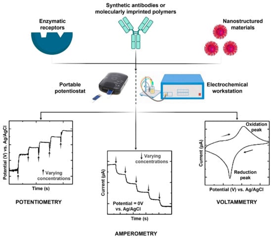 However, in recent years, electrochemical (bio)sensors have become a reliable alternative for POC analysis due to their fast analytical response, high sensitivity and accuracy, and simplistic operation [,]. POC analyses require portable systems [], and thanks to recent advancements, complex benchtop instruments can be replaced by miniaturized electroanalytical devices as small as a smartphone, permitting people to perform tests without extensive training. The electrochemical (bio)sensors, as portable POC disease diagnostics, either make use of biological receptors such as enzymes or employ synthetic responsive materials, which provide a sensitive interface for the creatinine-specific interactions. Herein, we present an overview of the characteristics of different receptors and electrochemical principles, along with their performance, limitations, and challenges.