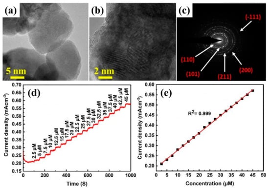 (a,b) HRTEM (high-resolution transmission electron microscopy) images of SnO2@Cu2O hybrid electrodes; (c) SAED (selected area electron diffraction) pattern of SnO2@Cu2O hybrid nanostructures; (d) amperometric sensor response of SnO2@Cu2O nanostructures toward different concentrations of creatinine; and (e) the analytical curve between current density and creatinine concentrations for calculating sensitivity. Adapted from Ullah et al. [], American Chemical Society (2022).