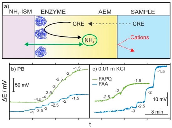 (a) Working mechanism underlying the all-solid-state creatinine biosensors. The responses of the electrodes prepared with FAPQ (NMP) and FAA (n-propanol) at 4 wt.% are displayed for increasing creatinine concentrations in (b) PB and (c) 0.01 M KCl backgrounds. NH4+SM—ammonium-selective membrane; AEM—anion-exchange membrane; PB—phosphate buffer; FU—Fumion-based membranes. The numbers in the plots indicate the logarithmic concentrations of creatinine. Adapted from Liu et al. [], American Chemical Society (2020).