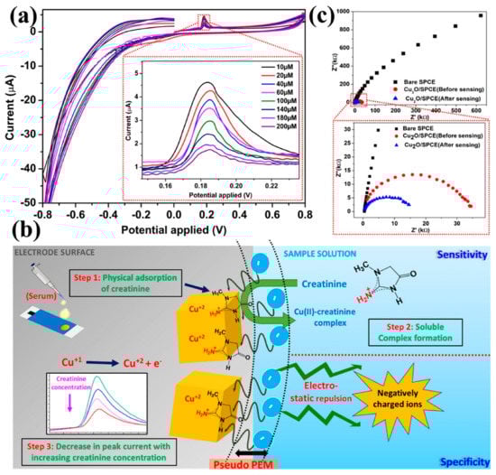 Recently, Kumar et al. [] utilized zwitterion (N-hexadecyl-N,N-dimethyl-3-ammonio-1-propanesulfonate) functional Cu2O nanoparticles to generate a pseudo-proton-exchange membrane that was believed to electrostatically hinder interfering substances from reaching the surface of electrodes, as shown in Figure 7. Hence, the specificity of the voltammetric creatinine sensor was enhanced using an enzymeless approach without a significant loss in sensitivity. The creatinine sensor demonstrated high specificity against different interfering analytes such as acetic acid, glucose, ascorbic acid, urea, and uric acid. They also observed a linear response to 10–200 μM creatinine concentrations with a fast response time (<50 s) and excellent reproducibility.