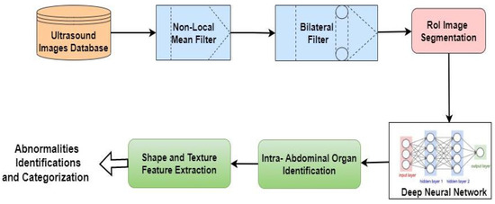 To enhance the ultrasound images, a bilateral filter and an NLM filter were applied to the initially processed UI in order to detect anomalies in the intra-abdominal organs. The use of NLM filtering restores the majority of pixels in an image, based on their similarity to the target pixel. Compared to LMA, the use of NLM filtering can guarantee less feature loss and significantly more post-filtering clarity. A bilateral filter adds a second layer of filtering to protect the organ’s boundaries. A bilateral filter modifies the power of each pixel with a weighted mean of the power values from neighboring pixels. Finally, better UI were used to divide the ROI of the organ. To increase the quality of the UI, it is necessary to recall the element data in the image and safeguard the edges.