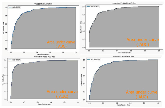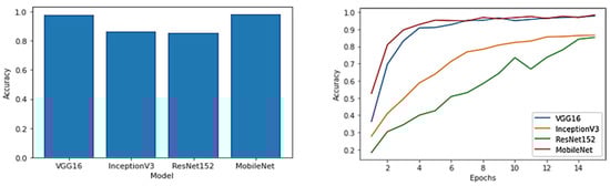 To evaluate the proposed approach, we trained the four previously described CNN models (VGG16, InceptionV3, ResNet152, and MobileNet) using our dataset. A total of 80% of the dataset was used for training, while 20% was used for testing. The dataset used in the training phase was different from the one used in the testing phase.