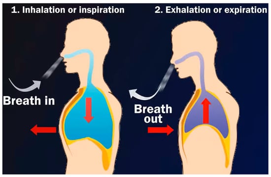 The breathing process of humans is separated into two stages: inspiration and expiration. In order to be inspired, one must breathe air into the lungs. During inspiration, the diaphragm lowers, and its muscles contract. As a result, the volume of the chest hollow expands. The air force within the chest hollow drops. High-pressure oxygenated air from outside the body flows quickly into the lungs. The alveoli are reached by oxygenated air in the lungs. The alveoli walls are thin and are bounded by a blood vessel network. The process of expelling air from the lungs is known as expiration. During expiration, the diaphragm muscles relax and the diaphragm travels upward. Then, the capacity of the chest hollow decreases. The pressure within the chest cavity rises. This causes carbon dioxide to be discharged out of the body. This process can be demonstrated as shown in Figure 1.
