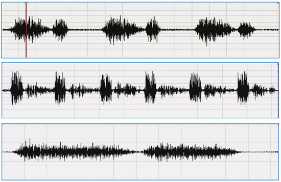 Sample of a normal lung sound waveform [6]: vesicular—normal (upper), bronchial (middle), normal tracheal (lower).