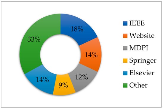 Simple statistical representation on the most popular considered reference databases is shown in Figure 5, which shows IEEE with 22 (18%), Science Direct and Websites with 14%, MDPI with 12%, and Springer with 9%. The remaining 33% of the selected articles are from other published sources. This indicates that such publications are widely discussed as they touch on human health.