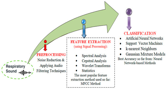 The major goal of using the respiratory sound dataset is to create a model that can distinguish between healthy and unhealthy lung sounds or to create a model that can distinguish between respiratory disorders by detecting sound abnormalities. The machine learning pipeline employed by the majority of existing projects is divided into three stages. The first is respiratory sound preprocessing using audio filtering and noise-lessening methods. The second phase is feature extraction, which is accomplished by the use of signal processing methods such as spectrum analysis [35,36,37,38], Cepstrum analysis [39,40,41], wavelet transformations [18,42,43], and statistics [44]. The third stage is classification, and the most often used classifiers were K-nearest Neighbors [32,45,46,47,48], Support Vector Machines [49,50,51,52,53], Gaussian Mixture models [54,55], and Artificial Neural Network (ANN) [49,56]. The workflow representation from preprocessing to classification can be shown in Figure 6.