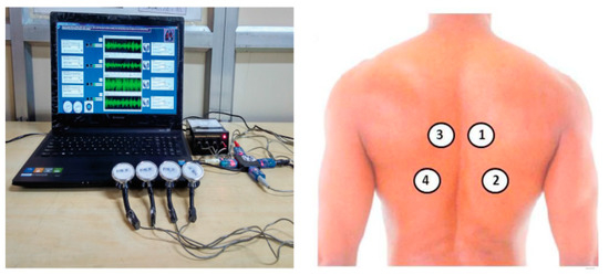 A device for collecting lung sound signals in the back places of the chest. The numbers in the right image correspond to the sensors on the left one.