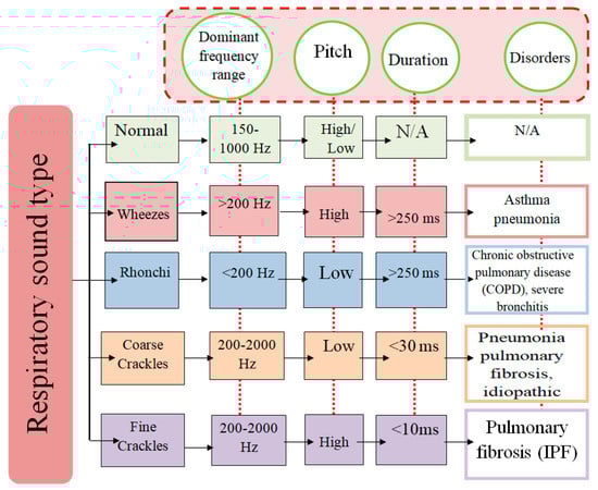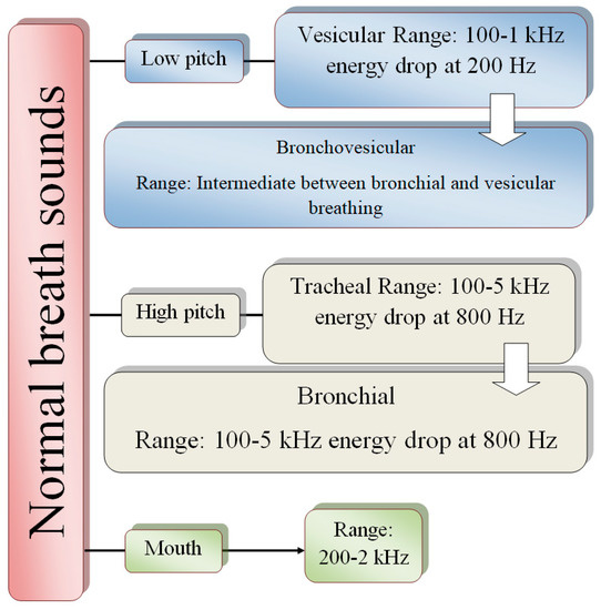 The air path inside the chest is disrupted due to a pulmonary deficit. The data enclosed inside the signal waveform, such as strength, timbre (or quality), and frequency are respiratory sound features to help diagnose common lung disorders. The normal breathing sound with its associated noises and distinct features can be classified as shown in Figure 8.