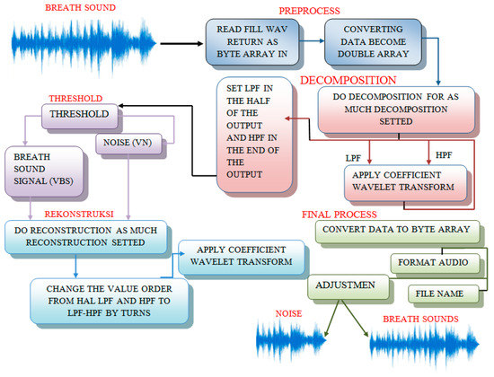 - Syahputra, M.F.; Situmeang, S.I.G.; Rahmat, R.F.; Budiarto, R. Noise reduction in breath sound files using wavelet transform based filter. In Proceedings of the International Conference on Electrical Engineering, Computer Science and Informatics (EECSI), Semarang, Indonesia, 26–25 November 2016. [Google Scholar] [CrossRef]