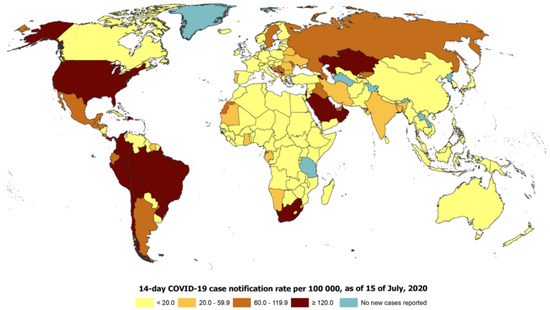 SARS-CoV-2 was first recognized in China, after which the severe pneumonia yielded by the virus, called COVID-19, rapidly circulated worldwide [1,2]. COVID-19 has different clinical symptoms, such as dyspnea, fever, cough, myalgia, fatigue, gastrointestinal complications, and headache [3,4]. This virus is risky and affects the mortality of individuals with compromised immune systems. Medical professionals and infectious disease experts from the entire globe are seeking a solution for the disease. COVID-19 has been the primary source of death in many countries around the world, with the United States, Italy, and Spain having one of the highest number of deaths [5]. Figure 1 demonstrates the global 14-day COVID-19 case notification rate per 100,000 as of 15 July 2020.