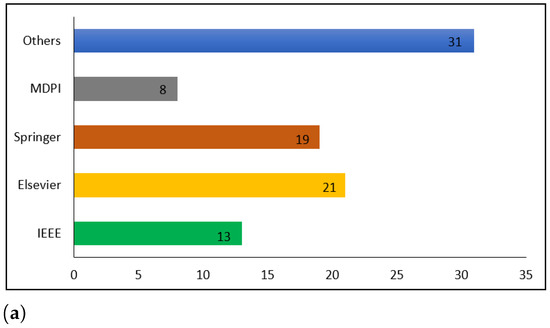 The IEEE database was subject to a review of 620 studies that were evaluated according to their titles and abstracts. This screening led to the exclusion of 459 documents, as their material was not related to the analysis, and the remaining 161 were chosen for a full-text review. After a full-text review of the studies, 148 were rejected, and the remaining 13 were included in the present review. In total, the titles and abstracts of 1123 studies from the Springer database were scanned through. After the screening process, 992 documents were deemed unsuitable and only 131 were qualified for a full-text review. In total, 112 of the studies were disregarded and 19 were ultimately included in this study. The titles and abstracts of 1201 studies in the Elsevier database were examined. After the screening was finished, 1102 documents were disregarded because they had no association with the investigation, leaving 99 documents to be analyzed for a full-text review. From these studies, 21 were accepted and 78 rejected. A review of the MDPI database was conducted, resulting in 337 studies, with the evaluation based on their titles and abstracts. The screening process resulted in the elimination of 301 documents, as they were not relevant to the analysis, while 36 were selected for a full-text review. A complete textual analysis of the studies led to the rejection of 28, while the remaining 8 were included in the current review. Finally, the titles and abstracts of 1504 studies in other databases were evaluated. Following the screening, 178 documents were kept for a full-text review, since the other 1326 had no association to the topic being studied. Out of these studies, 147 were rejected and 31 were used for the final analysis.