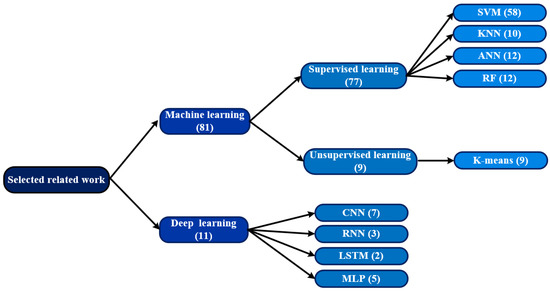 In this study, we selected 11 deep-learning-based studies, shown in Table 3. Overall, the number of works presented based on deep models is small; however, their accuracy in datasets with a large number of data is superior to ML methods.