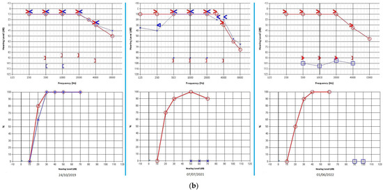 In the considered articles, the clinical evaluation of audio-vestibular signs/symptoms was based on different tests, including pure tone and speech audiometry, ABR, vHIT, and VNG (see Table 2). Interestingly, no cases of hearing loss progression similar to Case 1 of our series were reported in the available literature (see Figure 1b and Figure 5).