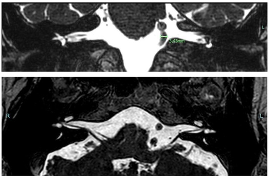 A 68-year-old male patient complaining of bilateral hearing loss and ear fullness (worse on the left side) was referred to our Unit to undergo a course of Eustachian tube insufflations. The patient also suffered from bilateral tinnitus in the previous 10 years and recurrent episodes of benign paroxysmal positional vertigo (BPPV), as previously diagnosed and treated in our clinic, according to international diagnostic criteria [14,15]. HBP under medical treatment was reported. Otoscopy was normal. Pure tone audiometry showed a bilateral mild to moderate asymmetric sensorineural hearing loss (PTA 31.25 dB on the right ear; 51.25 dB on the left one). Speech recognition tests revealed reduced SRT on the left side (37 dB on the right ear vs. 67 dB on the left one). Tympanograms were normal with the presence of contralateral acoustic reflexes bilaterally. An on–off effect (diphasic impedance change) on the left side was found. ABR revealed a slight delay of the fifth wave on the left side (5.80 ms on the right ear vs. 5.89 ms on the left one). Brain MRI (Figure 2) showed white matter lesions in the centrum semiovale, a normal representation of the acoustic-facial package on both sides, and a dolichobasilar artery (Smoker classification 5/7).