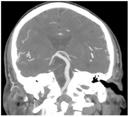 Cerebral CT angiography image of Case 3, showing 2/7 (Smoker’s classification) basilar dolichoectasia.