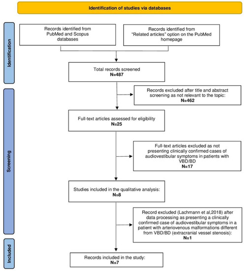 PubMed and Scopus electronic databases were searched for papers on vertebrobasilar dolichoectasia published in the last 22 years (from 1 January 2000 to 1 March 2023). The search strings were as follows: “basilar dolichoectasia tinnitus” OR “basilar dolichoectasia hearing” OR “basilar dolichoectasia vertigo” OR “vertebrobasilar dolichoectasia tinnitus” OR “vertebrobasilar dolichoectasia hearing” OR “vertebrobasilar dolichoectasia vertigo” for PubMed; (basilar AND dolichoectasia AND tinnitus) OR (basilar AND dolichoectasia AND hearing) OR (basilar AND dolichoectasia AND vertigo) OR (vertebrobasilar AND dolichoectasia AND tinnitus) OR (vertebrobasilar AND dolichoectasia AND hearing) OR (vertebrobasilar AND dolichoectasia AND vertigo) for Scopus. The “Related articles” option on the PubMed homepage was also considered. Titles and abstracts of papers available in the English language were examined. The identified full texts were screened for original data, and the related references were retrieved and checked manually for other relevant studies. Studies were included when the following general criteria were met: (i) articles were original reports; (ii) studies included only clinically confirmed cases of audiological symptoms in patients with vertebrobasilar dolichoectasia; (iii) investigation reported detailed information about diagnostic workout and/or treatment results; (iv) study design was not editorial, letter to the editor, or review; (v) the report was written in the English language. Included studies were analyzed to extract all available data and ensure eligibility for all patients. Descriptive data of epidemiology, etiology, symptoms, diagnostic procedures, treatments, outcomes, and follow-up were considered.