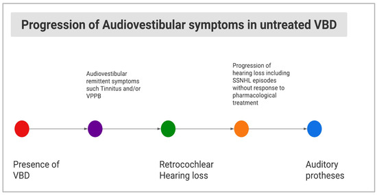 Diagram showing hypothesis of the natural history of audio-vestibular signs/symptoms in untreated VBD.