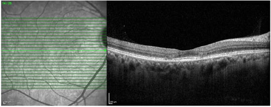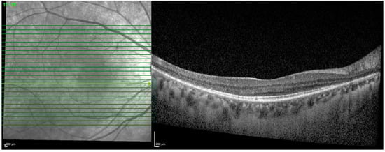 En face OCT is an emerging technique that combines SD-OCT with transverse confocal analysis, which generates transverse images and en face views of retinal and choroidal layers at a specified depth [90,91,92]. En face OCT can be used to assess structural changes in the coronal view and provide an extensive overview of pathological structures in a single image. Thus, it can be applied to characterisation of structural changes in HCQ retinopathy (Figure 6).
