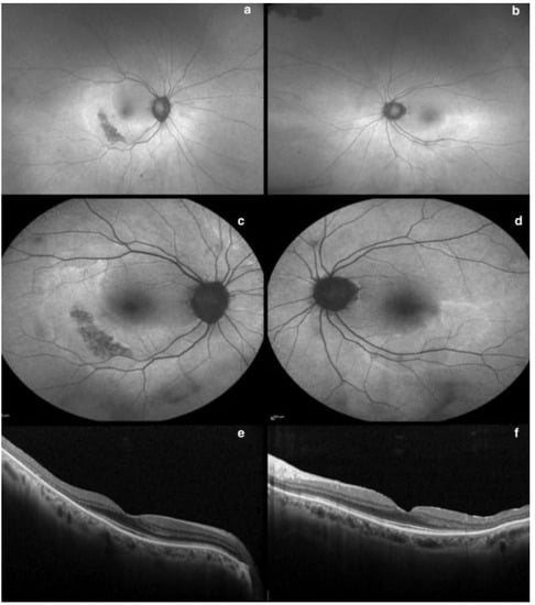 - Abdolrahimzadeh, S.; Ciancimino, C.; Grassi, F.; Sordi, E.; Fragiotta, S.; Scuderi, G. Near-Infrared Reflectance Imaging in Retinal Diseases Affecting Young Patients. J. Ophthalmol. 2021, 2021, 5581851. [Google Scholar] [CrossRef]