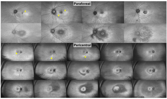 - Ahn, S.J.; Joung, J.; Lee, B.R. Evaluation of Hydroxychloroquine Retinopathy Using Ultra-Widefield Fundus Autofluorescence: Peripheral Findings in the Retinopathy. Am. J. Ophthalmol. 2020, 209, 35–44. [Google Scholar] [CrossRef] [PubMed]