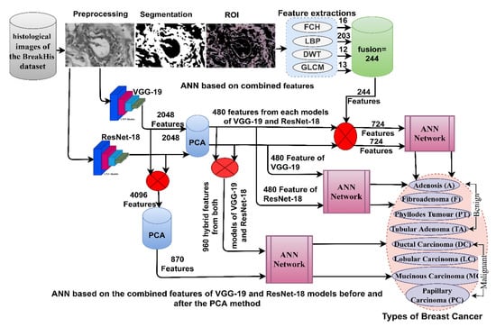 This section discusses the methodologies applied to the histological diagnosis of breast cancer. Images have been improved for good results in the following stages as shown in Figure 1. The PCA has been used to clear redundant and unnecessary features and select the necessary features for the VGG-19 and ResNet-18. The first technique for histological diagnosis of breast cancer was by ANN with selected features of VGG-19 and ResNet-18 using PCA method. The third technique for diagnosing images of breast cancer was by ANN with the combined features of VGG-19 and ResNet-18 before and after dimension reduction. The third technique for diagnosing the images of breast cancer was by ANN with hybrid features of VGG-19 and ResNet-18 separately with handcrafted features.
