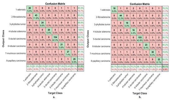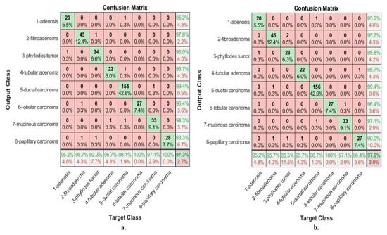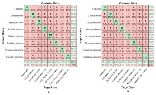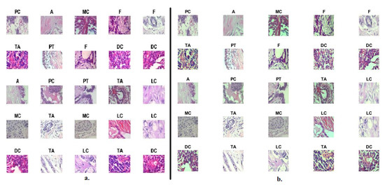 Biopsies of the abnormal breast tissue of the patient are considered one of the essential techniques for the diagnosis of breast tissue. A biopsy is taken from the patient’s breast and sent to laboratories for analysis by pathologists. The biopsy is placed on glass slides and analyzed under a microscope. The biopsy is converted into WSI with different magnification factors to be presented to researchers and interested people to devote their efforts to its diagnosis using artificial intelligence. This study analyzed and categorized abnormal breast cancer tissue images in the BreakHis Dataset to evaluate systems. The data set consists of 7909 images of abnormal breast tissue collected in 2014 from the P&D laboratory in Brazil. The data set is divided into four classes (types) of tissues for malignant tumors and four classes (types) of tissues for benign tumors. The dataset contains histological images with magnification factors of 40×, 100×, 200×, and 400× [26]. This study aimed to classify histological images at 40× and 400× magnifications. The dataset contains 1995 histological images of 40× magnification factor distributed among eight classes as shown in Table 1: 114 images of class Adenosis (A), 253 images of class Fibroadenoma (F), 149 images of class Phyllodes Tumor (PT), 109 images of class Tubular Adenoma (TA) and 846 A picture of Ductal Carcinoma (DC), 156 images of Lobular Carcinoma (LC), 205 images of Ductal Carcinoma (MC), and 145 images of Papillary Carcinoma (PC). The dataset contains 1820 histological images with a 400× magnification factor distributed among eight classes as follows: 106 images of class A, 237 images of class F, 130 images of class PT, 115 images of class TA, 788 images of class DC, 137 images of class LC, 169 images of class MC and 138 images of the class PC. Figure 2a shows histological images of BreakHis data set.