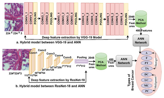 The hybrid methodology consists of two systems for diagnosis of images and discrimination of breast cancer types. In both systems, the improved histological images of breast cancer pass through many stages. The first system is as follows: First, filters are applied to optimize the histological images of breast cancer and fed separately to VGG-19 and ResNet-18. Second, VGG-19 and ResNet-18 pass images to many layers for analysis, extract deep features from all images and save them in 1995 × 2048 and 1820 × 2048 vectors for 40× and 400× magnification factors, respectively for both VGG-19 and ResNet-18 separately. Third, the features of both models VGG-19 and ResNet-18 are merged into vectors size 1995 × 4096 and 1820 × 4096 for magnification factors 40× and 400×, respectively. Fourth, the repetitive, unimportant features are deleted and the high dimensions are reduced by PCA method and saved in vectors of size 1995 × 870 and 1820 × 870 for magnification factors 40× and 400×, respectively. Fifth, the classification stage uses the ANN network, which receives vectors of size 1995 × 870 and 1820 × 870 for magnification factors 40× and 400×, respectively. Finally, the ANN was tuned to segment the dataset, train it, and test its performance.