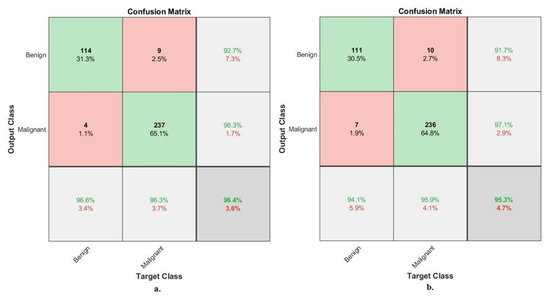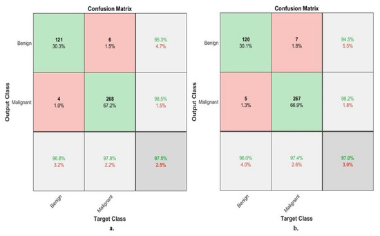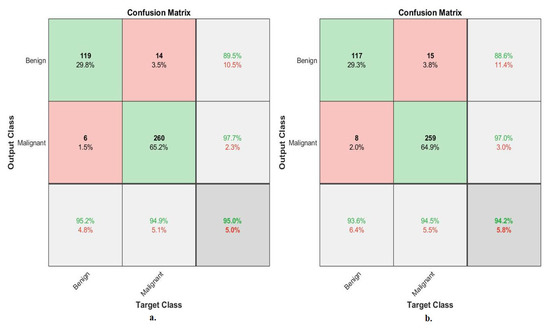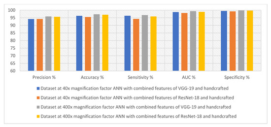 In contrast, with a magnification factor of 40×, ANN, with the features of ResNet-18, achieved an accuracy of 92%. Whereas, with a magnification factor of 400×, ANN, with the features of ResNet-18, achieved an accuracy of 90.1%. Second, with binary classes of breast cancer dataset with a magnification factor of 40×, ANN with the features of VGG-19 reached an accuracy of 95%. While with a magnification factor of 400×, ANN, with the features of the VGG-19, achieved an accuracy of 95.1%. In contrast, with a magnification factor of 40×, ANN, with the features of ResNet-18, achieved an accuracy of 94.2%. Whereas, with a magnification factor of 400×, ANN, with the features of ResNet-18, achieved an accuracy of 94%.