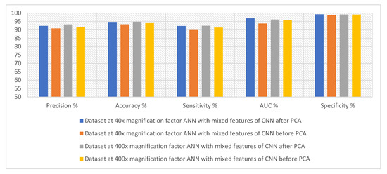Second, with the binary classes of the breast cancer dataset with a magnification factor of 40×, with the hybrid features of VGG-19 and ResNet-18 after reducing the dimensions, ANN reached an accuracy of 97.5%. Whereas with a magnification factor of 400×, with the hybrid features of VGG-19 and ResNet-18 after reducing the dimensions, ANN reached an accuracy of 96.4%.