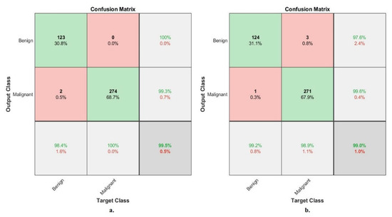 In this study, images of breast cancer tissues were analyzed using many different systems to diagnose and differentiate between benign and malignant tumors. The data set contains 1995 and 1820 images with magnification factors of 40× and 400× for eight types of tumors divided into four types of benign and four types of malignant. Benign tumors contain 625 and 588 histological images of magnification factors 40× and 400×, divided among the four classes of benign tumors unbalanced, as shown in Table 1. Malignant tumors contain 1370 and 1232 histological images of magnification factors 40× and 400× divided among the four classes of malignant tumors unbalanced, as shown in Table 1. Thus, the data set consists of eight unbalanced classes. All systems split the data set into 80% during training and validation to adjust parameters and 20% as new samples to test the ability of the systems to diagnose new samples. All the proposed technologies were implemented by the MATLAB 2018b operational environment on a 10th generation i5 processor with 16 GB RAM and 4 GB GPU.