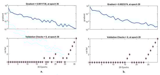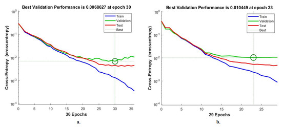 Figure 27 shows the evaluation of ANN performance for a multiclass breast cancer dataset with 400× magnification across all stages of a dataset. ANN, through its error histogram, achieved the best value for a network between 20 bins of −0.9016 and 0.9451 when fed with the hybrid features of VGG-19 + handcrafted features. ANN, through its error histogram, achieved the best value for a network between 20 bins of −0.9282 and 0.9503 when fed with the hybrid features of ResNet-18 + handcrafted features.