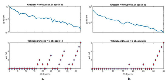 In this study, the ANN receives the selected low-dimensional features of VGG-19 and ResNet-18 models. ANN is characterized by its high performance in diagnosing breast cancer histology [38]. The ANN consists of three basic layers that receive the features and process them to perform the task of diagnosing each inputted image. In this study, the ANN input layer receives features of 1995 × 480 and 1820 × 480 for the magnification factors 40× and 400×, respectively. Thus, the input layer contains 480 features of both feature vectors 1955 × 48 and 1820 × 480 as shown in Figure 3. The features pass to the hidden layers, which consist of 15 hidden layers connected by tuned weights. All tasks are done in hidden layers, and each time the weights are updated, the minimum square error (MSE) is calculated [39]. The network continues to train the data (features) and change the weights in each iteration until it reaches the MSE between the expected and actual values, as in Equation (2) [40]. Each feature vector is sorted into a specific class. The output layer contains eight neurons, where each neuron represents one class in the data set. The multiclass dataset contains eight classes, so the output layer has eight neurons.